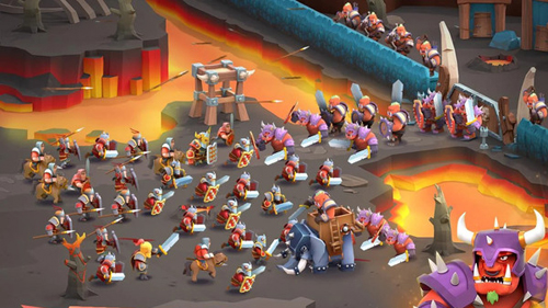 2、实时塔防与兵种操控:战斗中可拖动部队自由走位,如让骑兵绕后攻击敌方投石机,同时在我方阵地建造临时防御塔(箭塔、火药塔、治疗图腾)。