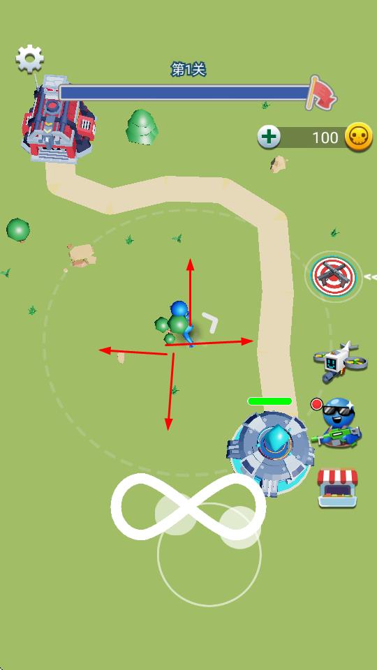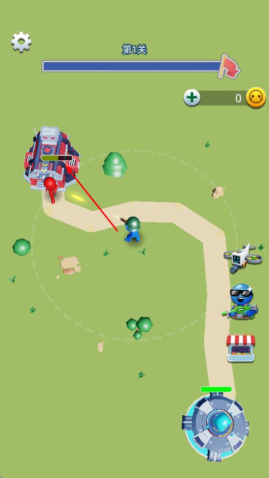 3、战斗中射击来袭敌人(红色火柴人),保护堡垒血量,推进第1关,解锁新武器、关卡。