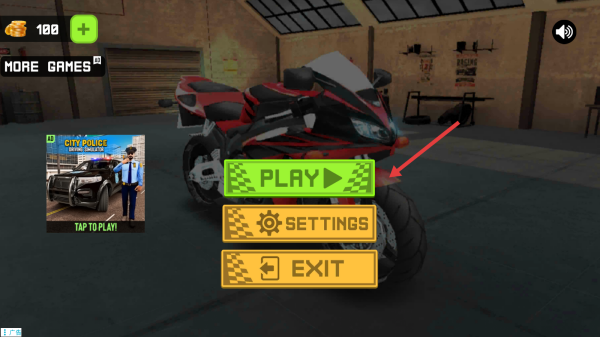 1、车库界面点击绿色【PLAY】,忽略左侧“MORE GAMES”及警车游戏广告,聚焦红黑摩托,进入模式选择页面开启摩托冒险。