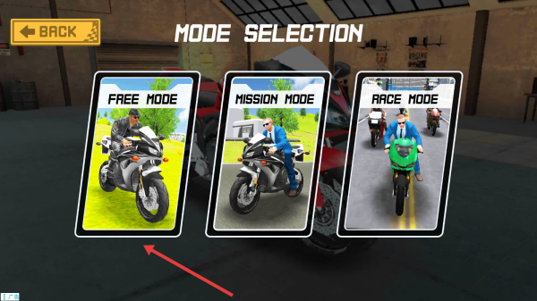 2、模式页选左侧【FREE MODE】,操控黑衣角色骑灰摩托,在无规则场景自由行驶,熟悉油门、转向等基础操作。