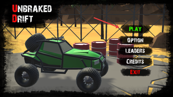 1、主界面点击【PLAY】,选定绿色越野车,进入《UNBRAKED DRIFT》沙漠赛道,开启无刹车漂移挑战,初始阶段适应沙地行驶惯性与操控逻辑。