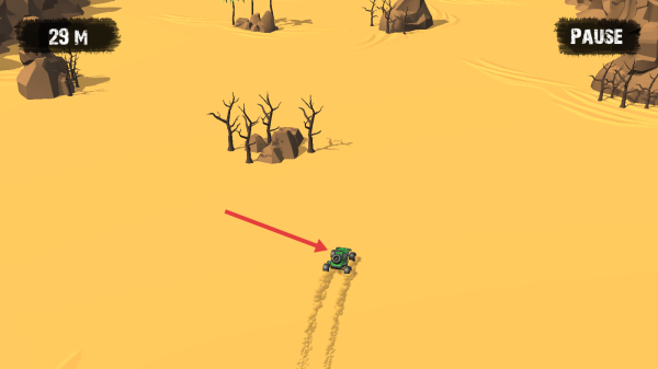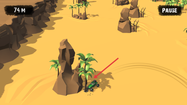 3、遇岩石、棕榈树区域,借漂移绕开障碍,利用沙地打滑特性调整路线,借助惯性维持速度,将行驶距离从29M提升至74M以上,突破赛道极限。