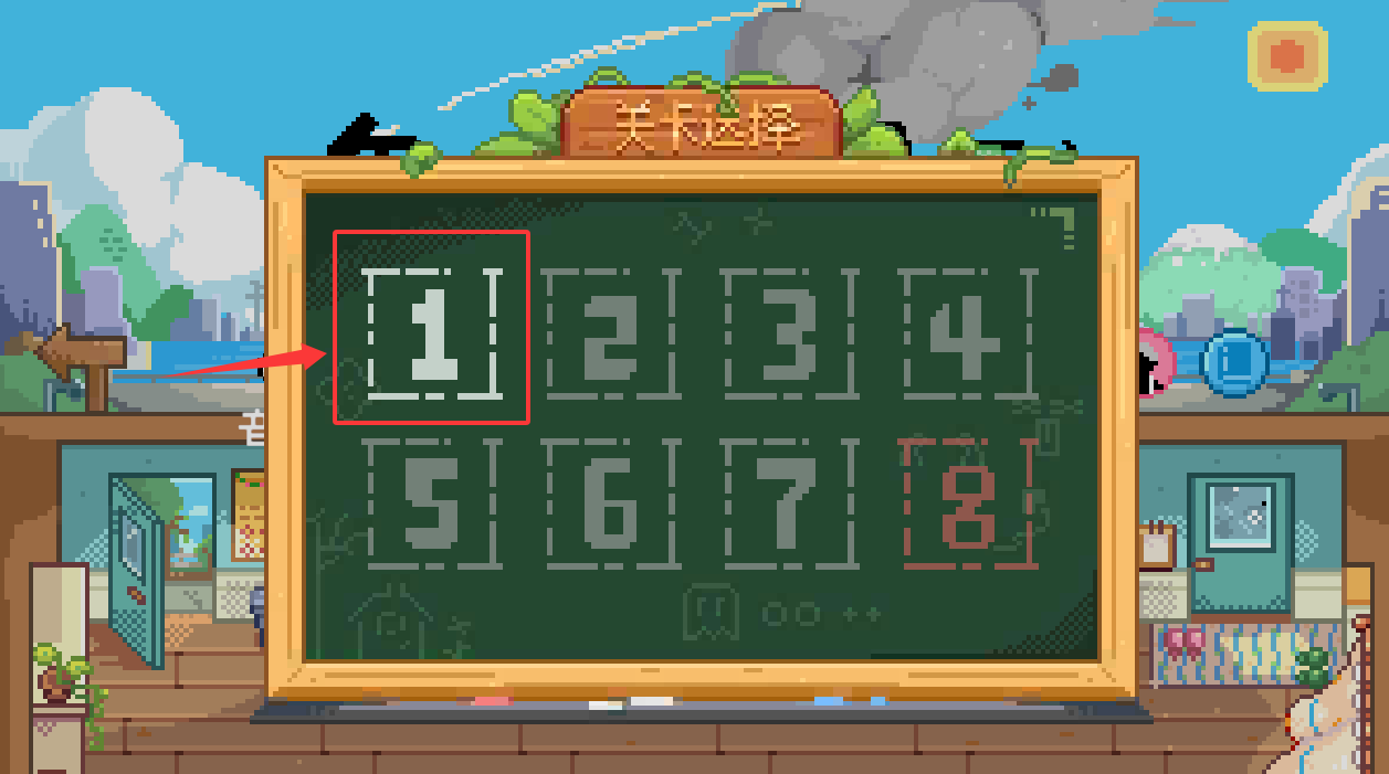 2、点击红色框框选择关卡1进入游戏。