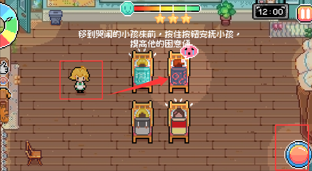 3、移动小人人到哭闹的小孩床前,按住右下角的按钮安抚小孩。