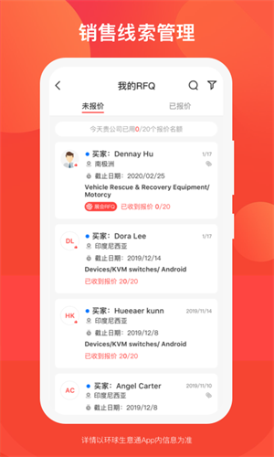 2.RFQ(RequestForQuotation,询价)管理:针对优质已核实买家的匹配询价,抢先报价,获取商机