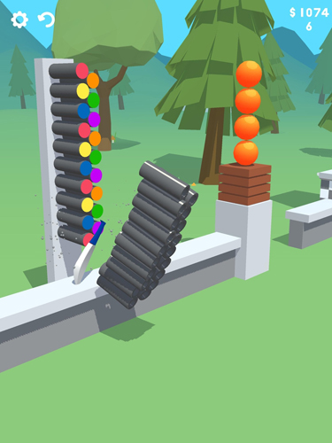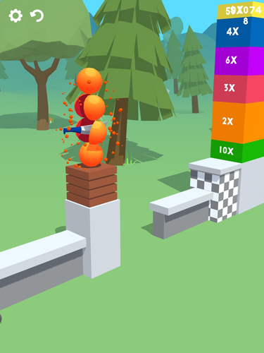 3、使刀具撞击带倍数标识(如【10x】【2X】等)的彩色积木塔,借助倍数效果,大量得分,助力通关进程。