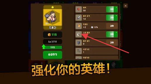 1、进入英雄界面,消耗金币,升级英雄等级,提升属性。