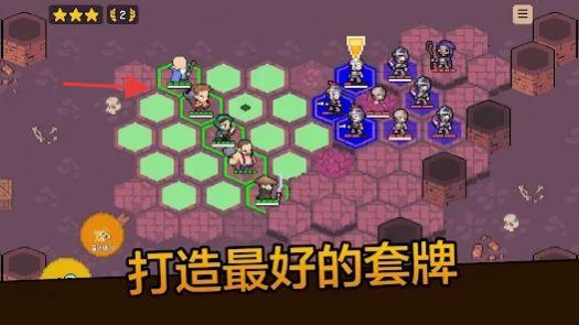 3、根据关卡需求,从卡牌库挑选英雄,在六边形格阵中布置,打造最强套牌,应对敌人,推进关卡。