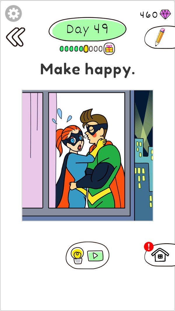 3、若遇困难,点击灯泡道具获取提示,或用播放按钮看演示,完成操作让角色开心通关。