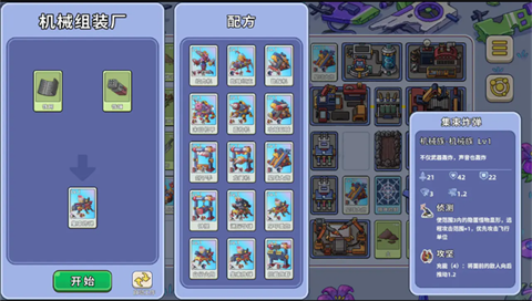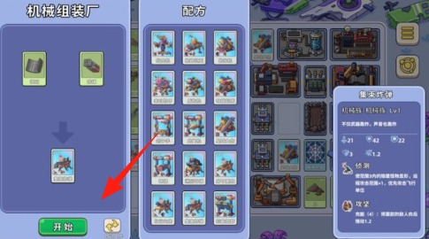 1、在机械组装厂,选好【箭头】指向的配方及材料,点击“开始”,制作对应机械。