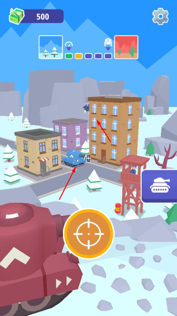 2、切换城市战场,操控己方坦克,利用建筑掩体,移动至目标点(蓝色坦克、建筑),攻击敌人。