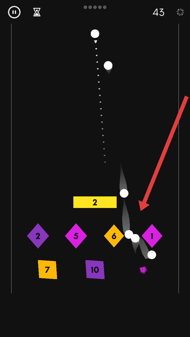 2、游戏中拖动白色小球瞄准,发射后借助物理反弹,撞击标有数字的彩色方块(如粉色“2”、蓝色“6”),通过碰撞改变方块数字,积累得分。