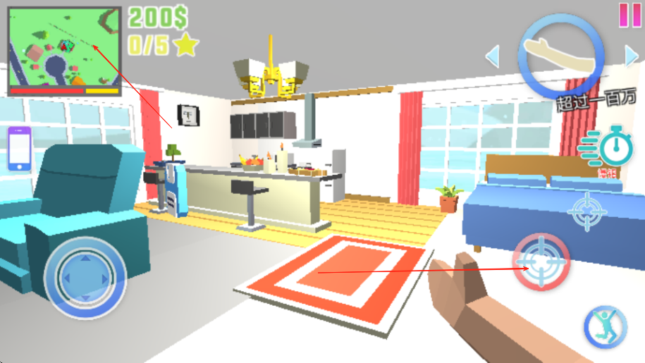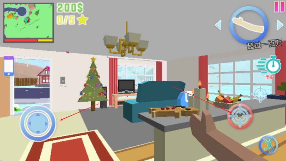 1、进入游戏后在主界面选择单人冒险或多人对战模式,降生在像素世界中后,通过移动摇杆控制角色,点击屏幕拾取地面枪械与弹药。