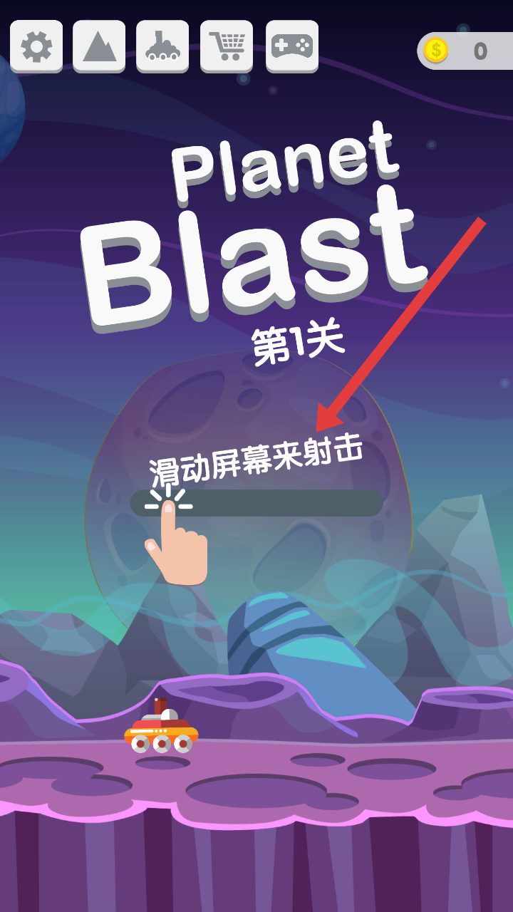 1、进入行星爆炸的第1关,需要按提示【滑动屏幕来射击】,操控橙色小车发射攻击,开启星球冒险。