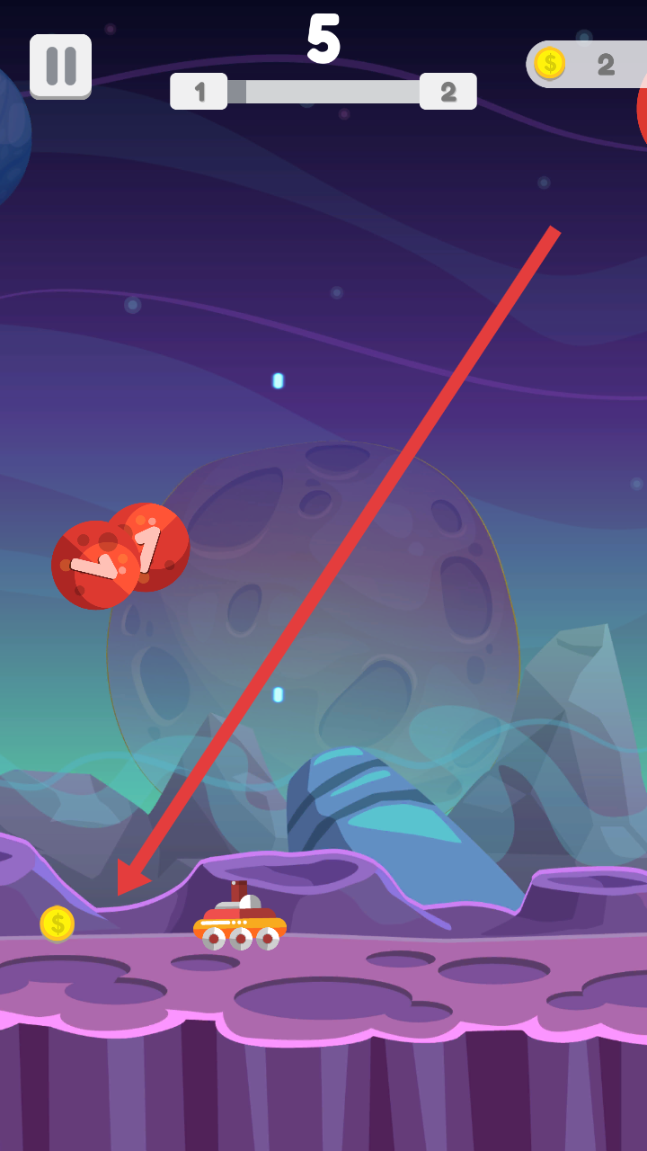 2、在行星爆炸游戏中,射击红色标“1”的球体,利用攻击摧毁目标,同时收集地面金币(黄色标识),推进关卡进程。
