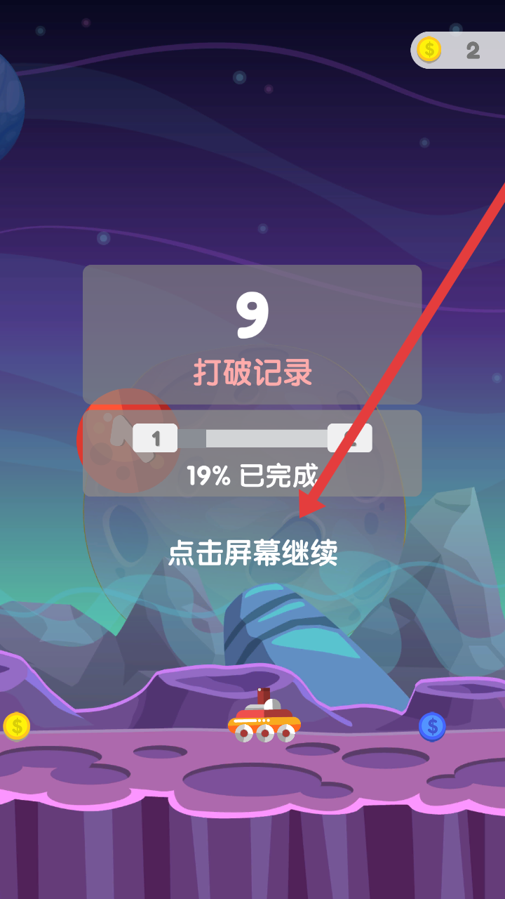 3、关卡结束后,界面显示【9打破记录】及【19%已完成】,点击【点击屏幕继续】,重新挑战突破更高分数与进度。