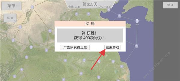 3、结局结算:达成“韩获胜”等结局,获“领导力”奖励,可“结束游戏”或看广告翻倍。