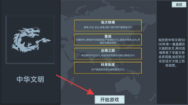 2、查看这个文明的效益情况,然后点击开始游戏。