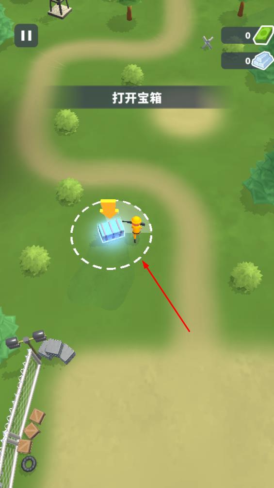 1、操控角色移动至宝箱处,点击“打开宝箱”,获取初始资源(绿色货币、蓝色方块)。