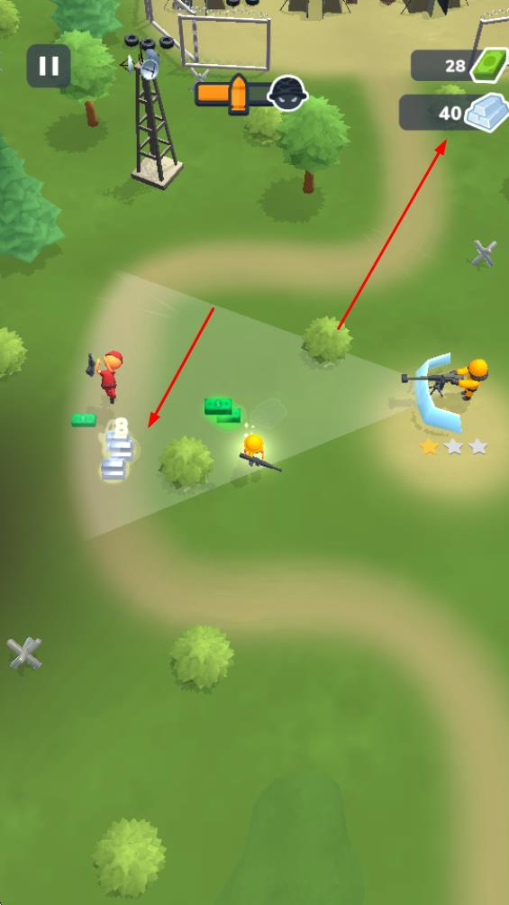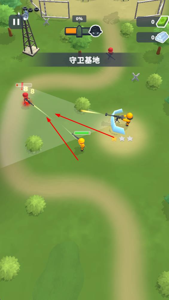 2、敌人(红色小人)来袭时,点击屏幕或自动瞄准,射击敌人,保护基地。