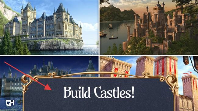 2、进入“Build Castles!”界面,选城堡样式,收集资源,按步骤建造梦幻城堡。
