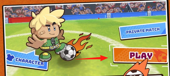 1、在主界面,点击【箭头】指向的“PLAY”按钮,进入足球对战模式。
