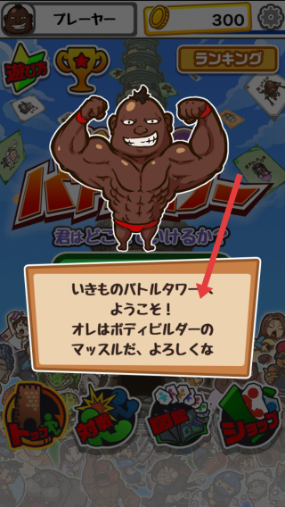 1、进入游戏界面展示角色“ボディビルダーのマッスル”,了解初始角色设定,开启冒险前的引导介绍。
