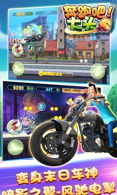 1、角色跑酷冒险:操控大头儿子等经典动画角色在奇幻场景中跑酷,躲避障碍物、收集道具,利用座驾和萌宠提升跑酷能力,完成冒险挑战。