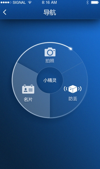 小精灵app(NAC)是最佳的手机防盗软件,他可以有效的帮助您管理自身财务,你可以将贵重物品与小精灵进行绑定,然后设置管理的距离,如果离开一定范围就为触发警报,同时还是非常方便的名片制作和接收工具,遥控手机拍照,一键寻物等应用。