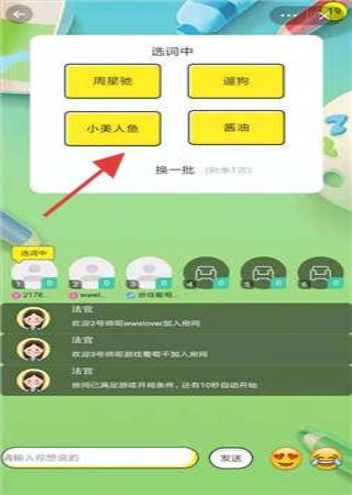 2、选词环节操作进入游戏后会有玩家进入选词状态,界面会呈现如周星驰遛狗等词语选项,可从其中挑选绘画题目,若不满意还能点击换一批来获取新词语。