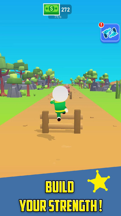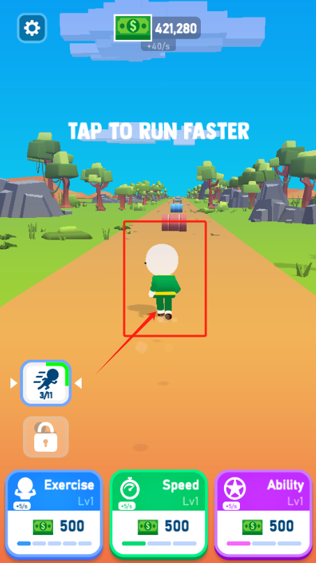1、快速点击屏幕让角色加速跑,攒够500金币就点下面三个升级按钮。