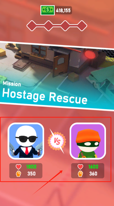 2、选好角色开始人质救援任务,看准血量和攻击力打败对面黑衣坏蛋。