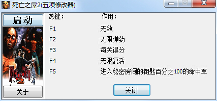 死亡之屋2修改器是专为游戏《死亡之屋2》打造的辅助工具,提供无敌、无限弹药、无限复活等功能。无敌功能有点变态,还是少用比较好,否则你会觉得玩的没什么意思的。有需要的朋友,赶快下载体验吧!