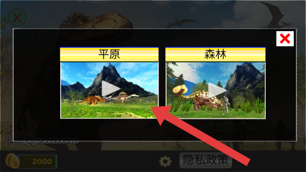 1、界面中显示了“平原”和“森林”两个场景选择项,箭头指向平原场景的缩略图,左下角显示金币数量为2000,还有隐私政策按钮。