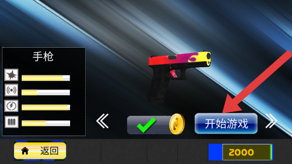 2、界面展示了一把名为“手枪”的武器,武器有彩色涂装,左侧有武器相关属性展示栏,界面下方有“返回”按钮,右侧箭头指向【开始游戏】按钮。