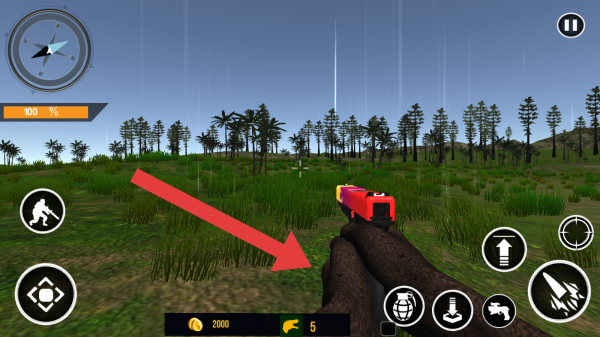 3、画面中玩家手持一把红色枪械,场景是野外草地与树林,左上角有罗盘,左下角是方向操控按钮,右侧是射击、换弹、投掷手雷等功能按钮。
