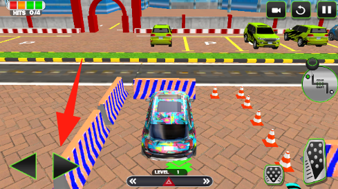1、在停车场景,点击【箭头】指向的左右转向按钮,操控车辆,避开障碍,完成停车。