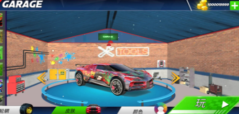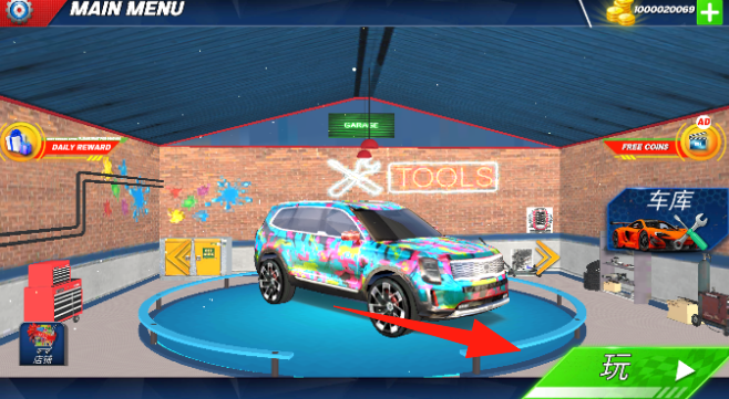 2、进入车库界面,点击【箭头】所指“玩”按钮,开始道路驾驶任务。