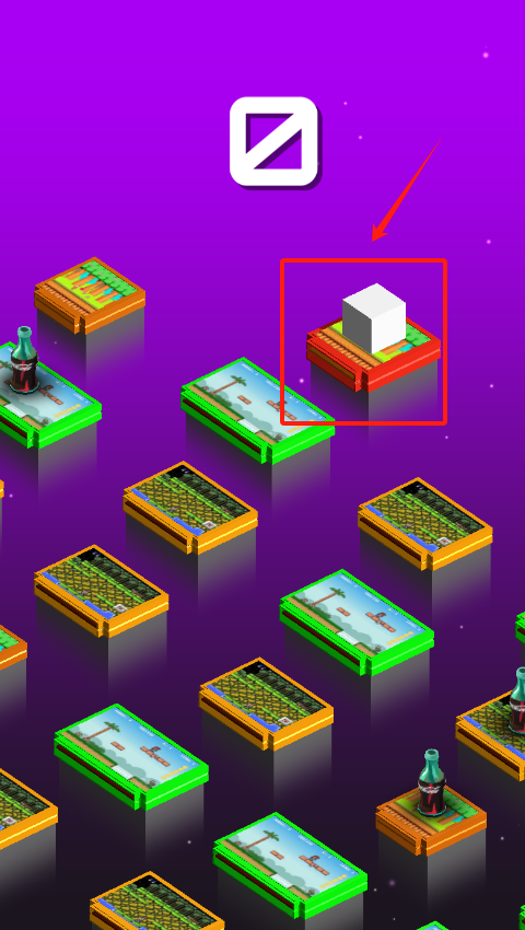3、看到红框标注的绿色平台托着白色方块,用手指点这个平台,就能操控方块跳跃到其他平台过关啦。