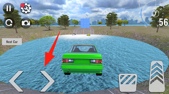 1、遇到水域障碍,点击【箭头】指向的转向按键,调整车辆方向,尝试通过。