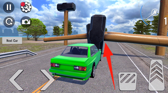 2、面对巨型锤子障碍,依据【箭头】指引,操控车辆,把握时机,避开或硬闯。