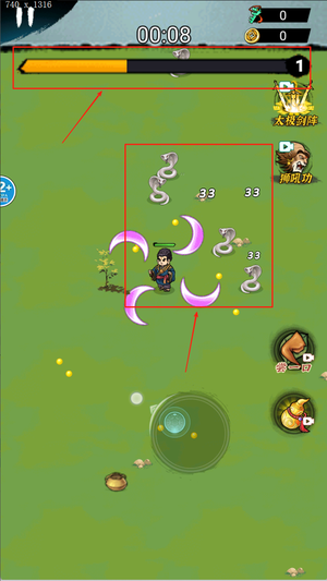 2、左侧控制角色移动右侧释放飞刀,在关键时刻点击按钮造成高额伤害,合理走位躲避敌人攻击保持生存优势。