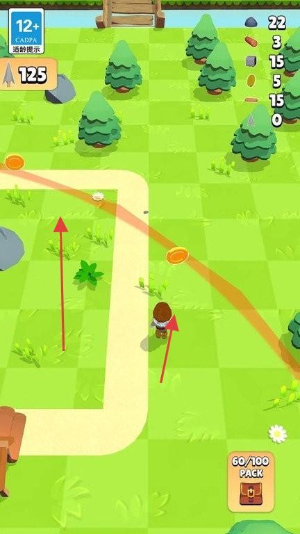 1、操控角色探索地图,沿路径收集金币、材料(石头、木材),积累资源。