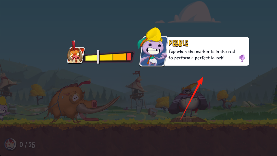 2、观察角色旁提示,待进度条到红色区域点击,让角色借助野猪等进行弹射攻击。