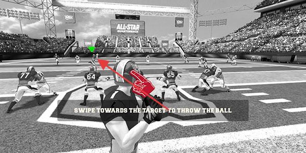 2、进入比赛,操控球员,按提示【SWIPE TOWARDS THE TARGET TO THROW THE BALL】,向目标滑动屏幕传球,参与进攻配合。