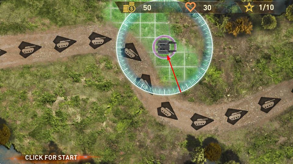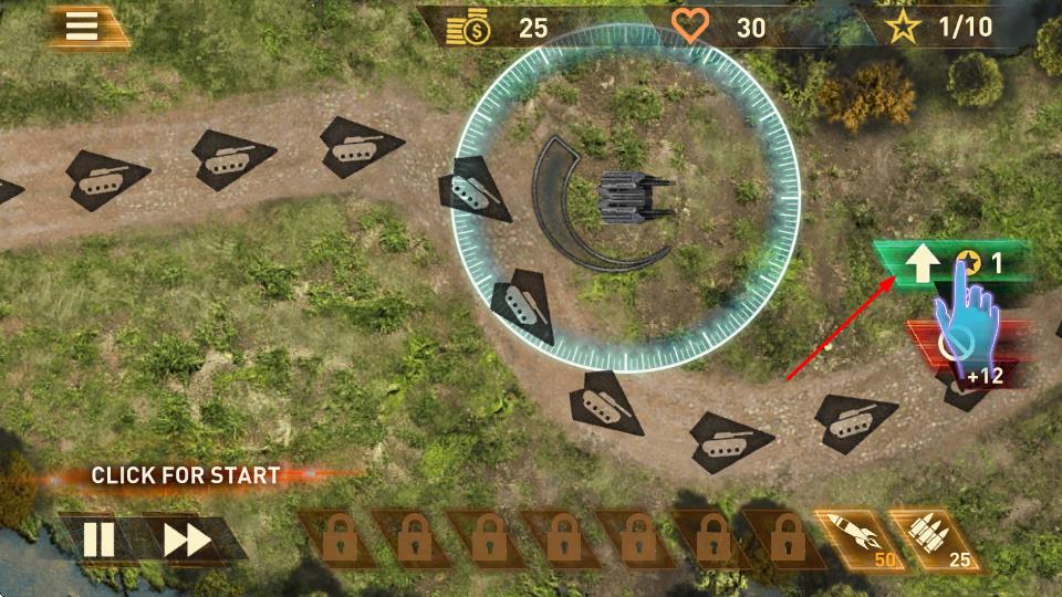 2、点击“CLICKFORSTART”触发敌方坦克进攻,操控技能(火箭、炸弹)摧毁敌人,保护基地。