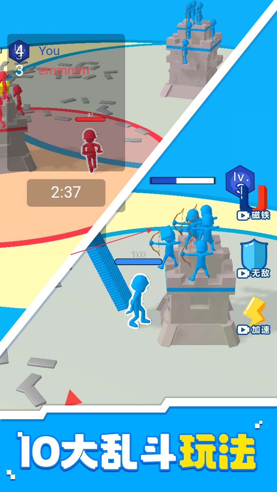 1、进入大乱斗模式,操控蓝色火柴人部队,利用“磁铁”“无敌”“加速”等技能,与红色敌人战斗,争取胜利。