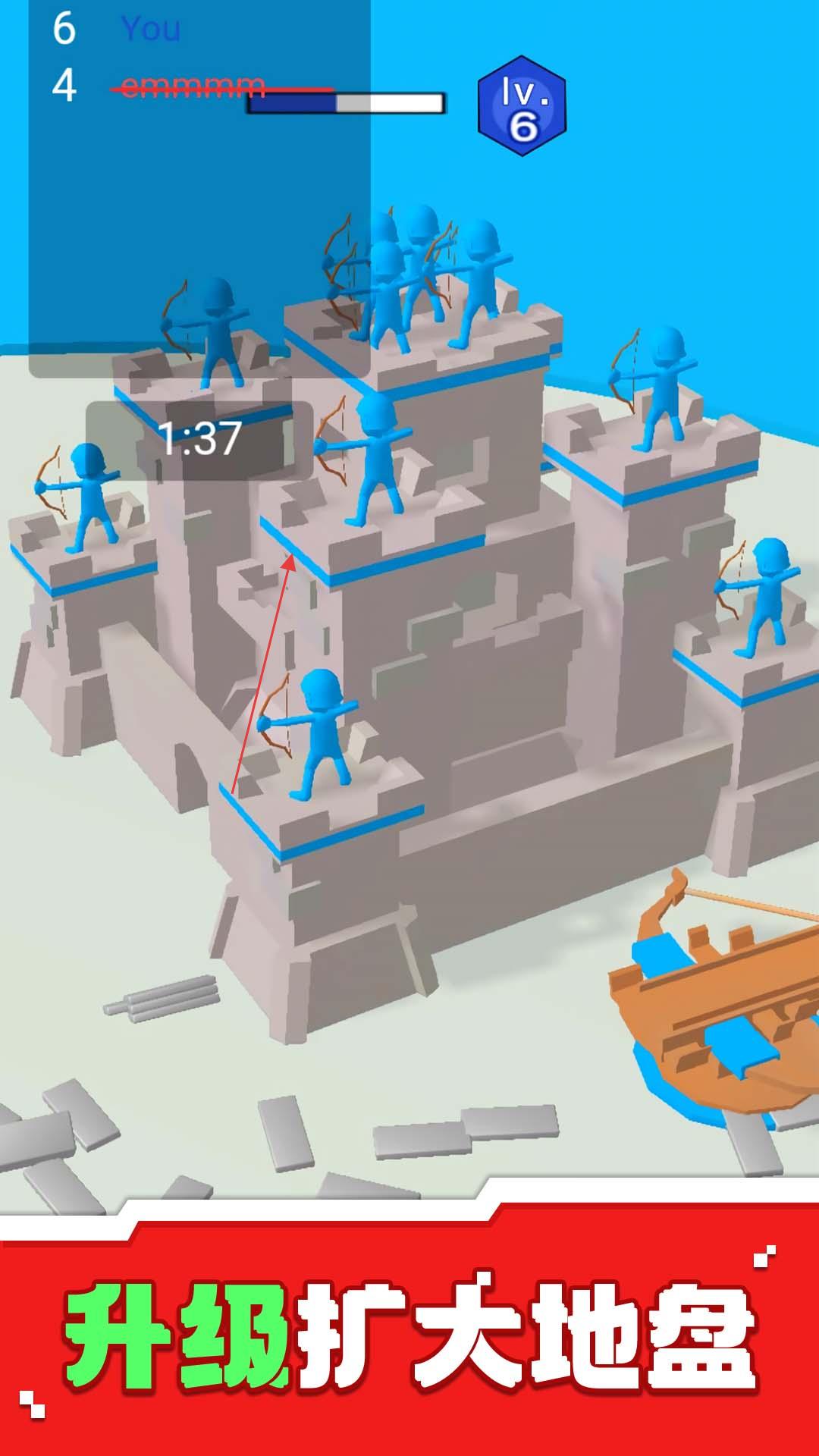 2、战斗获胜后,积累资源升级城堡,扩大地盘,提升防御与战力,让更多弓箭手驻守城堡,增强防御。