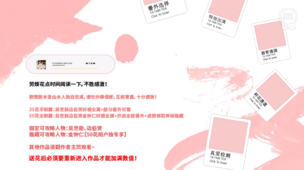 2、查看创作声明,知晓剧本为个人原创,按需点击【番外选择】等板块,体验额外内容,注意送花后重进作品生效福利。