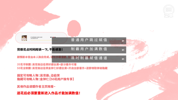 1、阅读作品说明,了解35花、50花等不同赞助档位福利,按需求选择【普通用户跳过赋值】等通道,送花后重新进入作品激活数值。